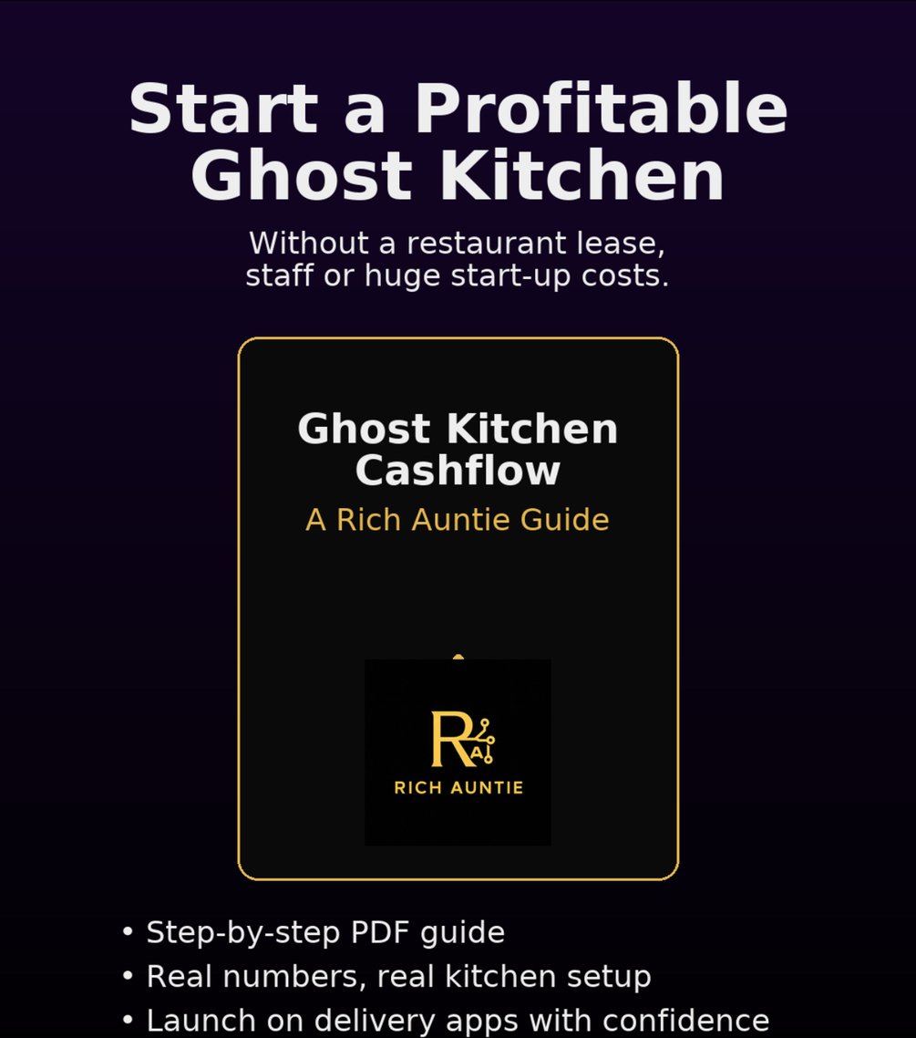 Ghost Kitchen Cashflow is a step-by-step PDF guide that shows you how to launch a profitable ghost kitchen brand using delivery apps and AI – without a restaurant lease, staff, or a huge budget.